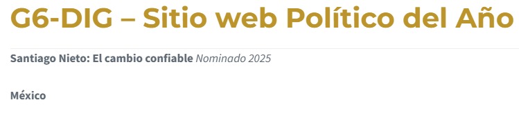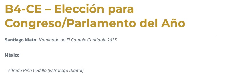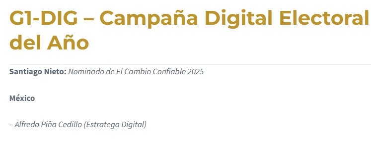 Estas nominaciones corresponden al proyecto “Santiago Nieto: el cambio confiable”, estrategia de comunicación política implementada durante su campaña al Senado de la República en 2024, reconocida por su enfoque digital, su narrativa de transparencia y su conexión social.