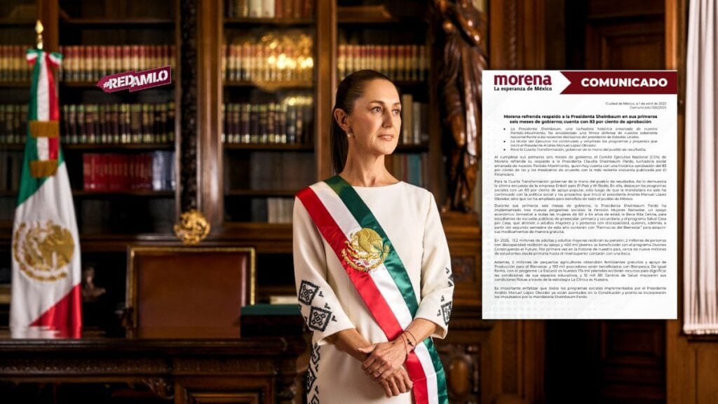 A seis meses del inicio del gobierno de la presidenta Claudia Sheinbaum Pardo, el Comité Ejecutivo Nacional (CEN) de Morena refrendó su total respaldo al liderazgo de la mandataria, quien alcanza una histórica aprobación del 83%, según la encuesta publicada por El Financiero. Esta cifra confirma el amplio respaldo popular al gobierno de continuidad de la Cuarta Transformación.